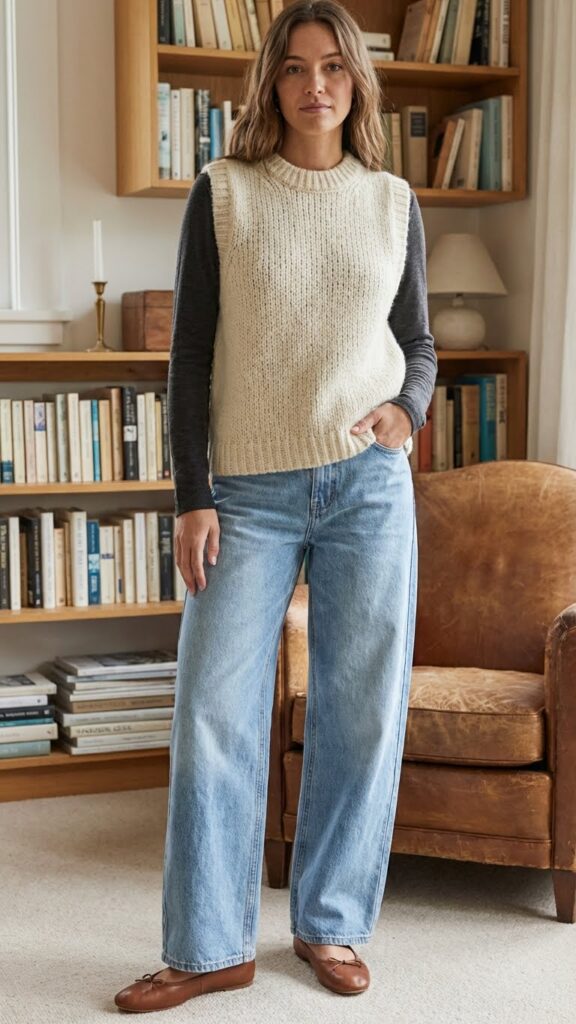 If you want to channel cozy academia vibes, this combination delivers. A chunky sweater vest layered over a fitted long-sleeve tee or button-down, paired with baggy jeans and ballet flats is peak comfort dressing with style. It’s giving library study sessions and coffee shop mornings in the best way possible.