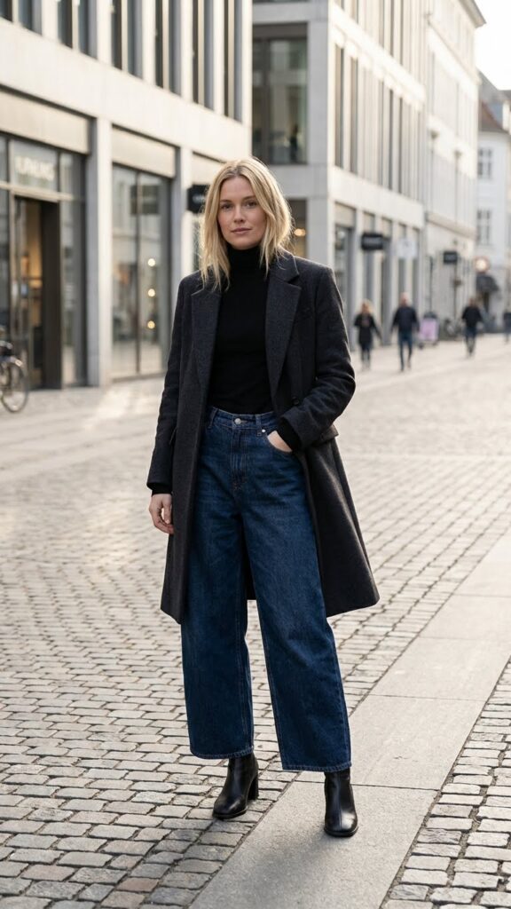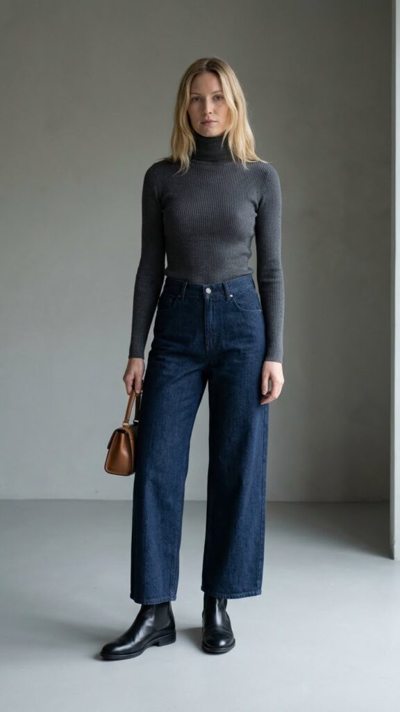 The beauty of this outfit is in the simplicity. Monochrome looks especially good here, think all black, all cream, or all navy. The turtleneck gives you coverage and warmth, the wide legs give you movement and comfort, and the Chelsea boots add just enough edge. Layer a long coat over everything when you head outside, and you’ve got an outfit that works for literally everything from gallery openings to coffee shop work sessions. Minimal jewelry keeps it clean, maybe just a watch and small earrings.