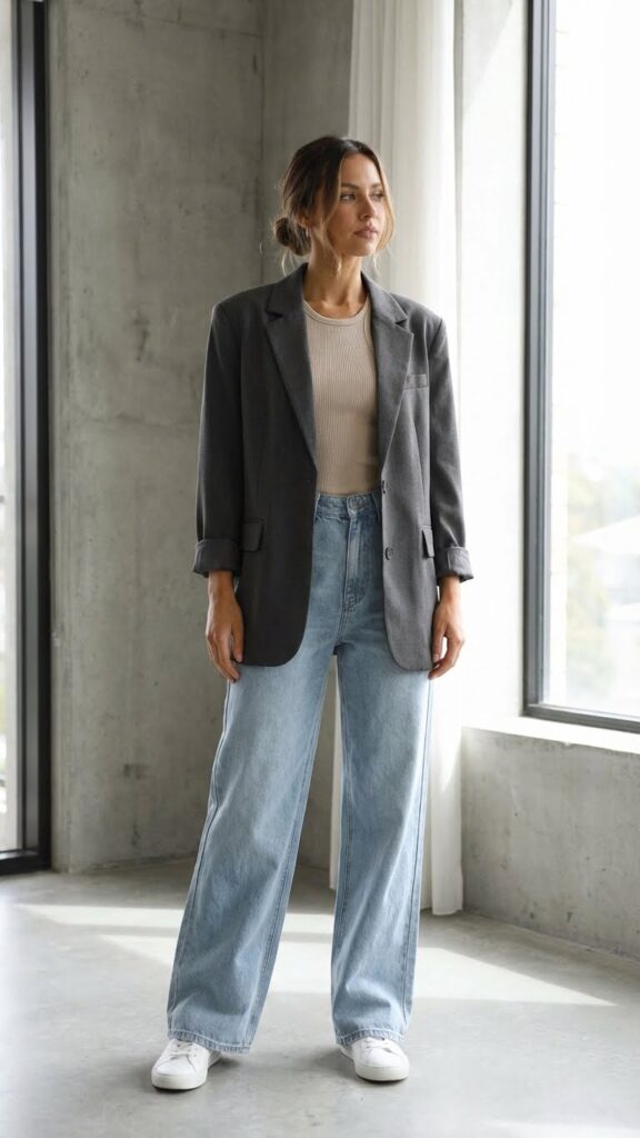 Okay, hear me out on this one. I know button-downs can feel stuffy, but paired with baggy jeans? Totally different vibe. Tuck a crisp button-down (white, striped, or even chambray) into your wide legs, add sleek ankle boots, and suddenly you’re serving effortless sophistication.