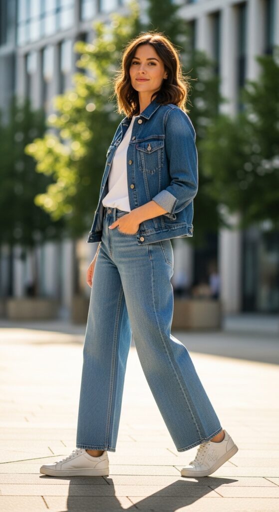 Some combinations just make sense together, and a denim jacket over wide leg trousers is definitely one of them. This pairing keeps things casual and approachable while still looking intentional. The structured denim balances the flowy trousers perfectly.