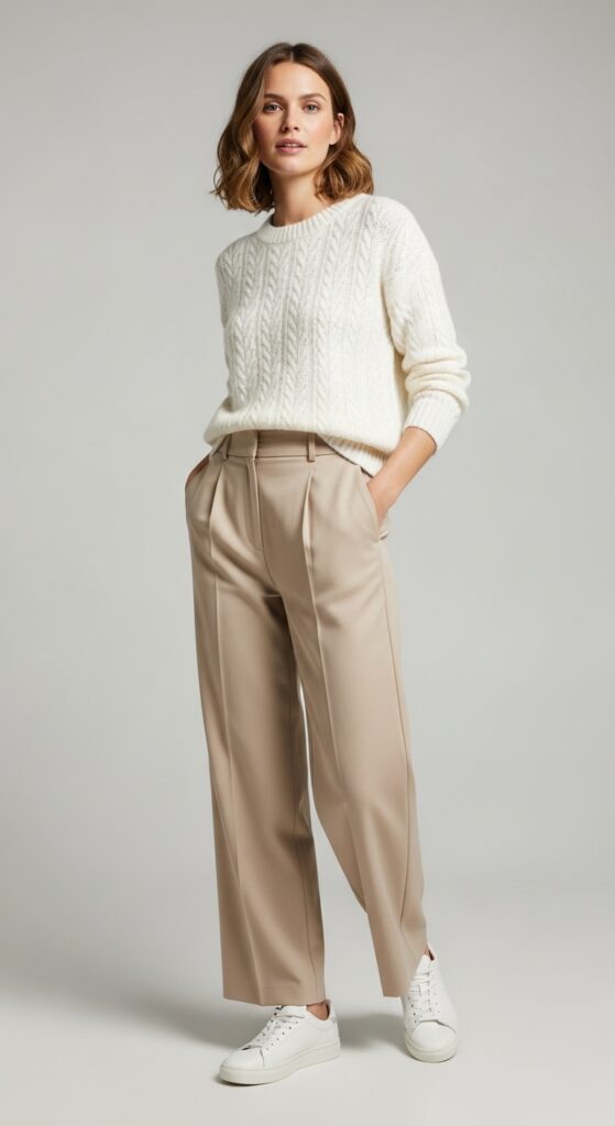 Keep the sweater slightly cropped or tuck it in to define your waist. Choose sneakers that are sleek rather than chunky for the most flattering proportions with wide trousers. This combo works year round with seasonal sweater swaps, lighter knits for spring and fall, heavier cable knits for winter.