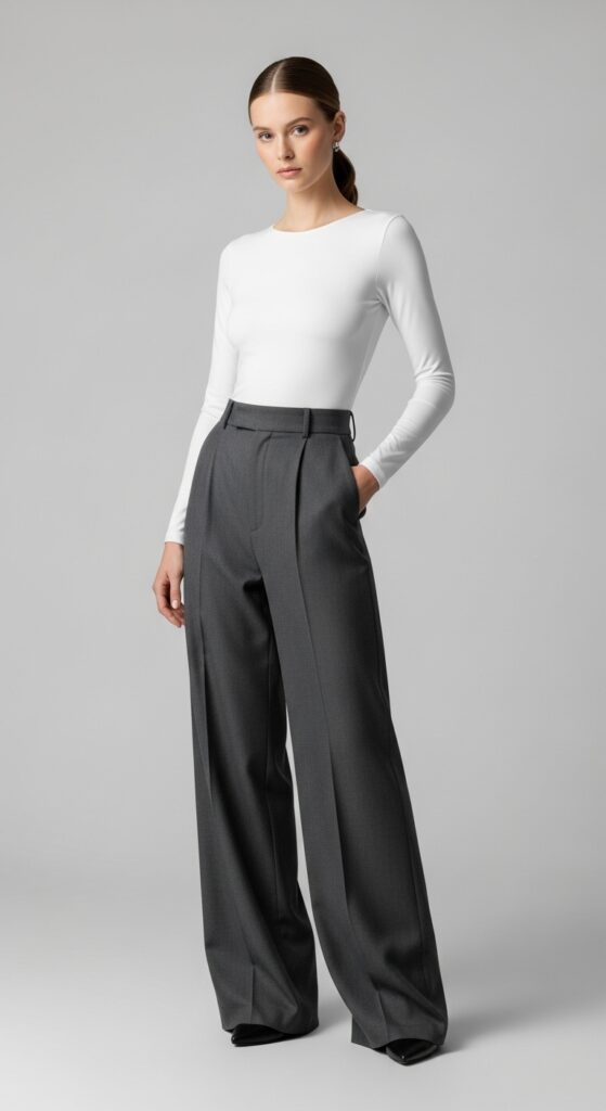 A fitted bodysuit in any style, square neck, scoop neck, or mock neck, creates that perfect smooth foundation. The trousers then flow from your waist without any fabric bunching or awkward lumps. Add a blazer or cardigan for layering, or let the bodysuit shine solo. This is one of those looks that works for literally any body type because of how sleek it sits.