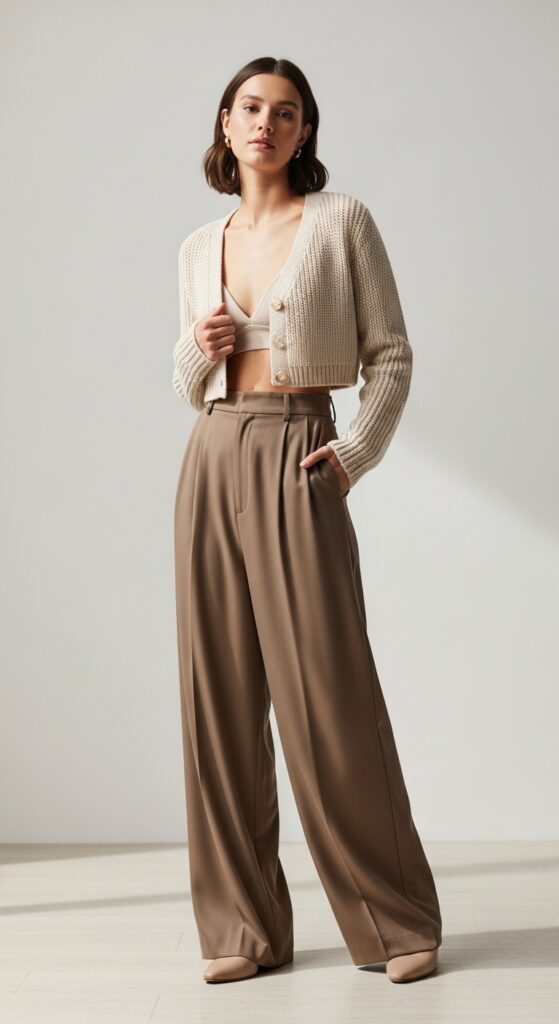 Okay, this one’s giving cozy but make it fashion. Pair your wide leg trousers with a cropped cardigan and let a cute bralette peek through. It’s the perfect balance of covered up and just a little bit spicy. The cropped length hits right at the waist of your trousers, which creates that perfect hourglass silhouette we all love.
