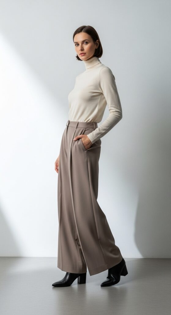 Go for a turtleneck in a neutral shade for maximum versatility, black, cream, camel, or gray all work beautifully. Add a long pendant necklace over the turtleneck for some visual interest, or keep it minimal. This outfit looks incredible with ankle boots, loafers, or even sneakers depending on your vibe that day.