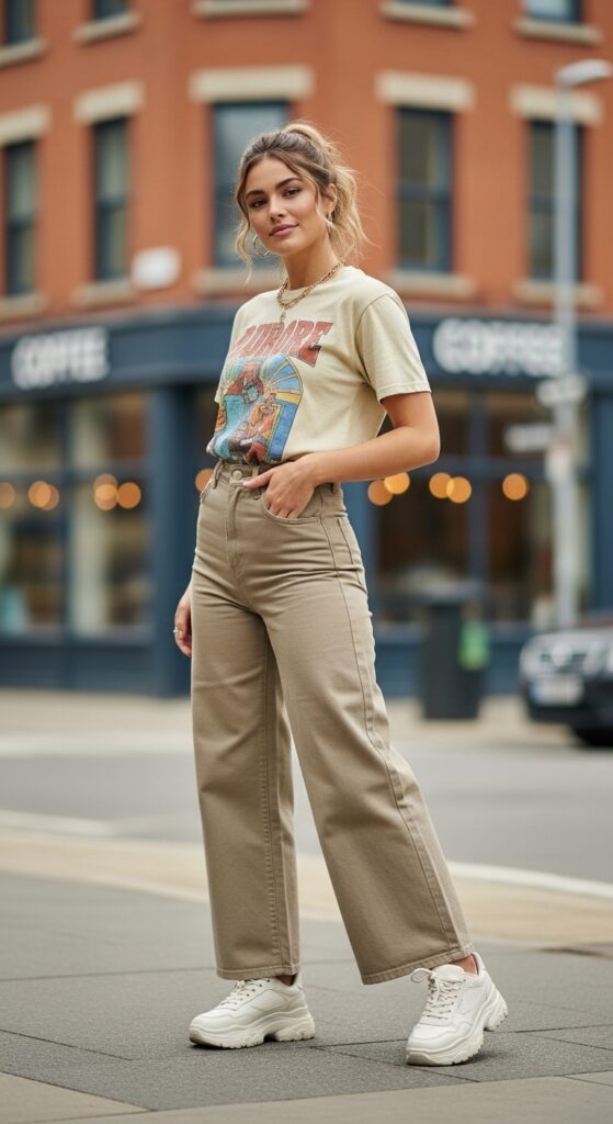 Not every outfit needs to be polished. Sometimes you just want to look cool without trying, and that’s exactly what a graphic tee with wide leg trousers delivers. It’s the perfect contradiction, relaxed tee meets sophisticated trouser, and somehow it just works.