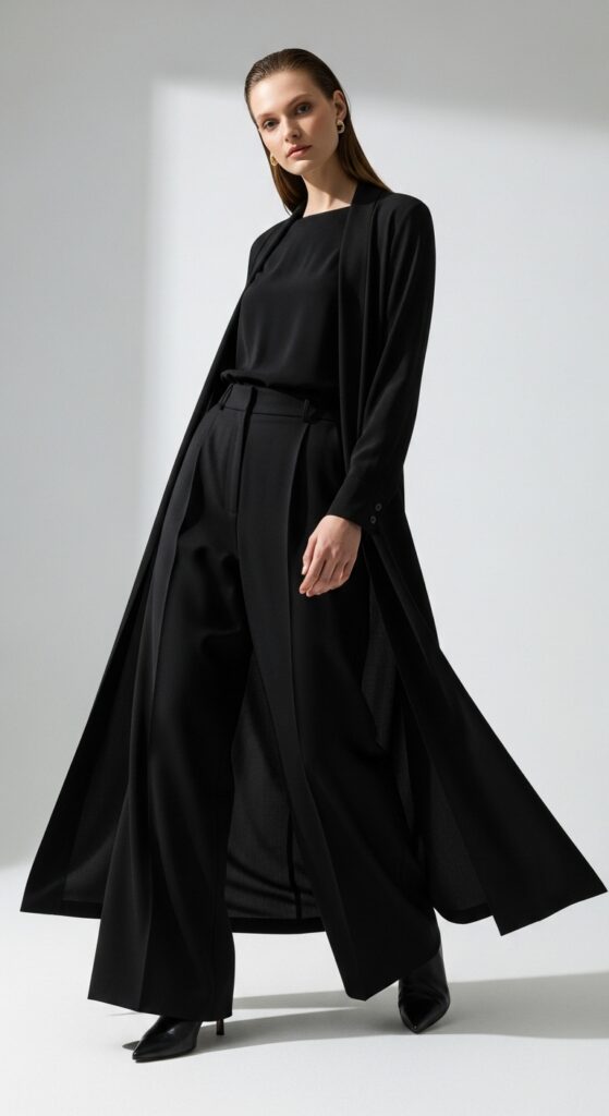 The wide leg trousers provide beautiful movement, and when everything flows in the same color family, the effect is incredibly elegant and elongating. Play with different textures to keep it interesting, maybe a silk blouse with linen trousers, or a cashmere sweater with wool pants. This approach flatters absolutely everyone because it creates one long, unbroken visual line.
