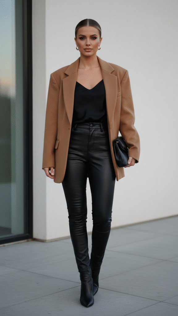 The cozy contrast between textures makes this outfit particularly striking. Choose a wool or tweed blazer in neutral tones like camel, grey, or black. Pair it with high-waisted leather pants that streamline your legs. Add a silk camisole or fitted turtleneck underneath for layering options.