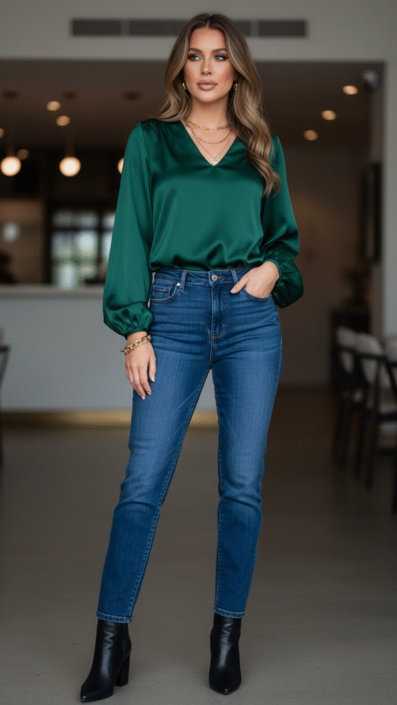 Choose a jewel-toned satin blouse that catches candlelight beautifully during evening gatherings. Tuck it into dark-wash high-waisted jeans that elongate your silhouette and provide structure. You’re creating layered textures by contrasting the smooth satin against denim’s rugged weave.