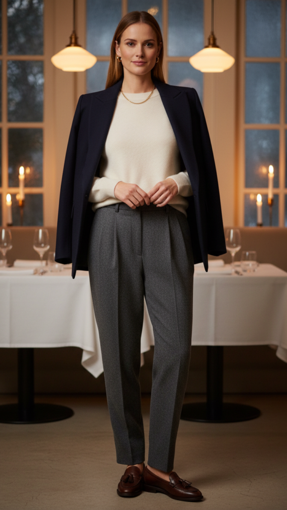 Complete your outfit with leather loafers or ankle boots, depending on the restaurant’s atmosphere. Add a structured blazer if you need extra warmth. This combination shifts seamlessly from casual bistros to upscale establishments, giving you confidence wherever you dine.