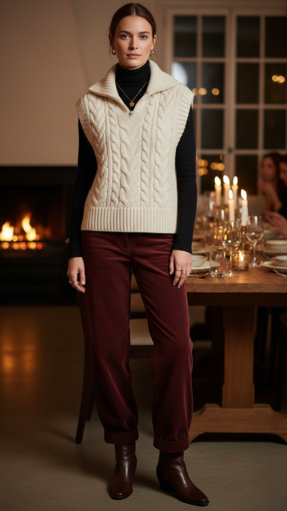 Pair them with a fitted turtleneck that balances the pants’ volume without creating an oversized silhouette. Your wool vest becomes the statement piece—select one with interesting details like cable knit patterns or contrast piping. Layer it over your turtleneck for added warmth and dimension. Complete the look with leather ankle boots and minimal gold jewelry. This combination works perfectly for upscale restaurants or casual dinner parties where you want polish without sacrificing comfort.