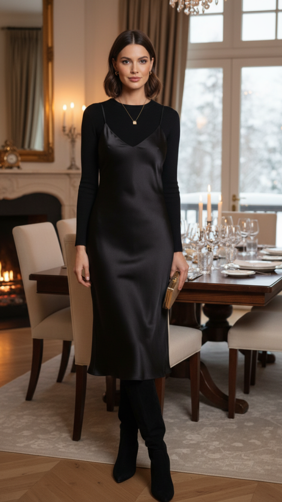 You’ll find accessorizing the slip dress opens endless possibilities for personal expression. Add knee-high boots and tights for extra warmth without sacrificing style. Layer a cropped leather jacket or oversized blazer on top when heading outdoors. Complete your look with delicate gold jewelry and a structured clutch. This combination proves you can adopt feminine silhouettes year-round while maintaining the freedom to move comfortably through any dinner venue.