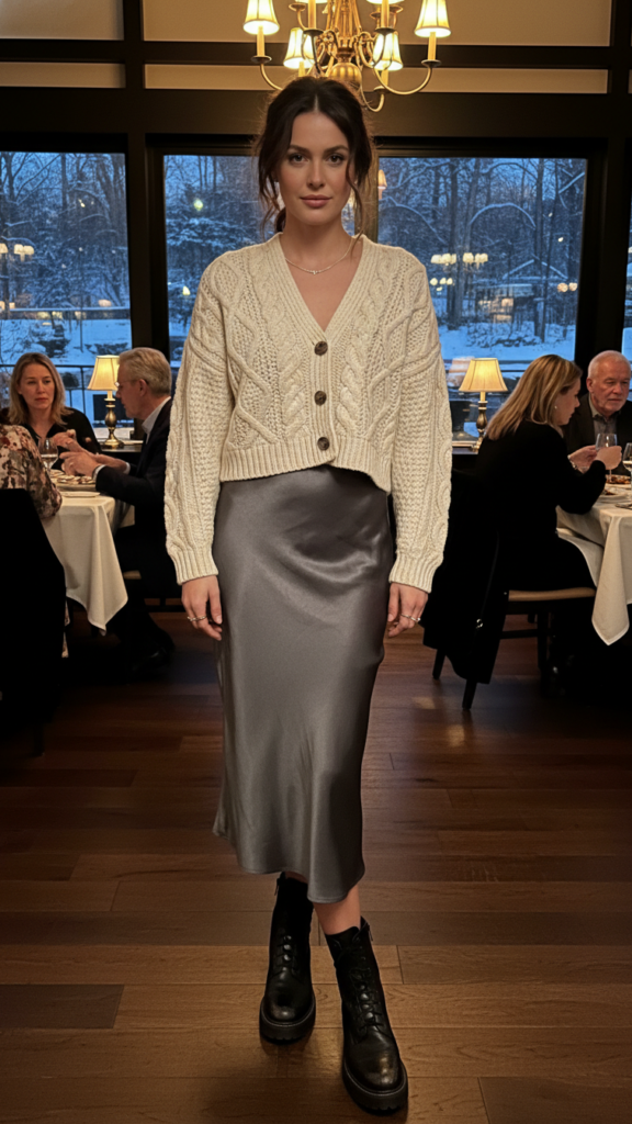 Cropped Cardigan Over a Midi Slip Skirt With Combat Boots