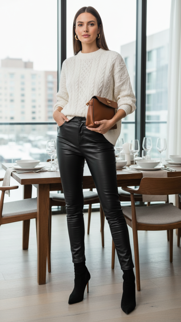 Choose leather pants in classic black or rich burgundy, then pair them with an oversized cream or camel sweater. The soft knit against smooth leather creates visual interest while keeping you comfortable throughout the evening. Tuck just the front of your sweater for a polished silhouette that won’t overwhelm your frame.