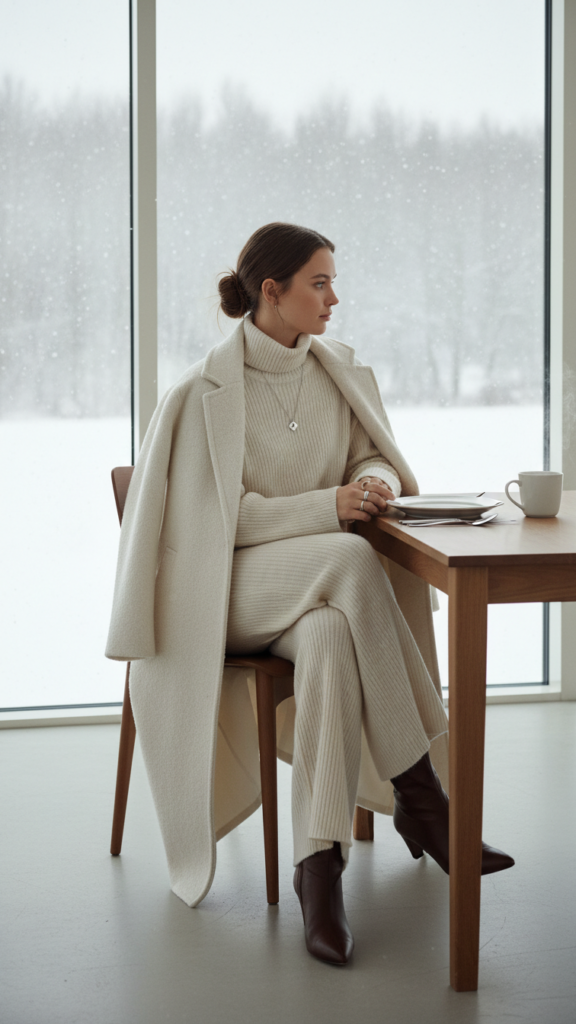 When you’re seeking effortless sophistication for winter dinners, a monochrome knit set paired with a long wool coat creates an instantly polished look. Choose matching sweater and trouser sets in neutral tones like cream, camel, or charcoal gray. The textured knit details add visual interest while maintaining the streamlined silhouette you want.