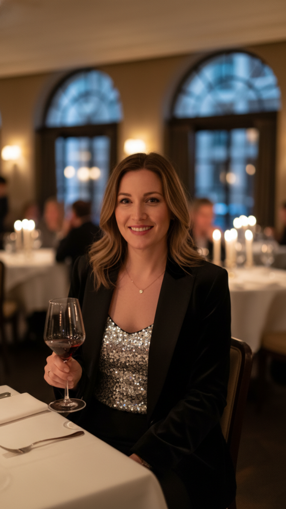 Strike the perfect balance between festive and refined by pairing a sequined top with a customized blazer for your winter dinner plans. This combination lets you shine without feeling overdressed, giving you the flexibility to adapt your look throughout the evening.