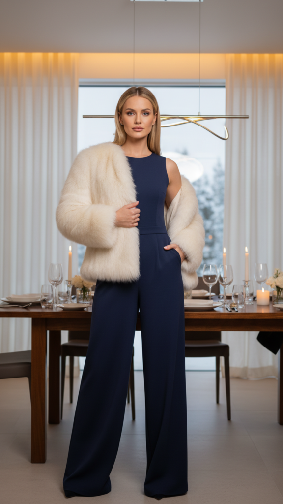 How often do you reach for the same dress-and-coat combination when you’re heading to a winter dinner? Break free from predictable patterns with a wide-leg jumpsuit paired with a luxurious faux fur jacket. This combination delivers both comfort and sophistication without sacrificing your personal style.
