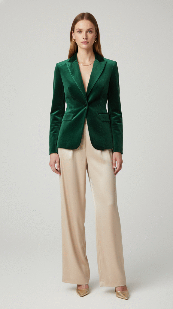 Choose a jewel-toned blazer with a custom-fitted silhouette that fits your shoulders perfectly and narrows at the waist. Deep emerald, burgundy, or midnight blue velvet creates stunning visual impact against silk’s smooth finish. Pair it with high-waisted silk trousers in complementary neutral shades like champagne, charcoal, or ivory. Elevating your winter dinner style can be achieved with this timeless and refined combination.