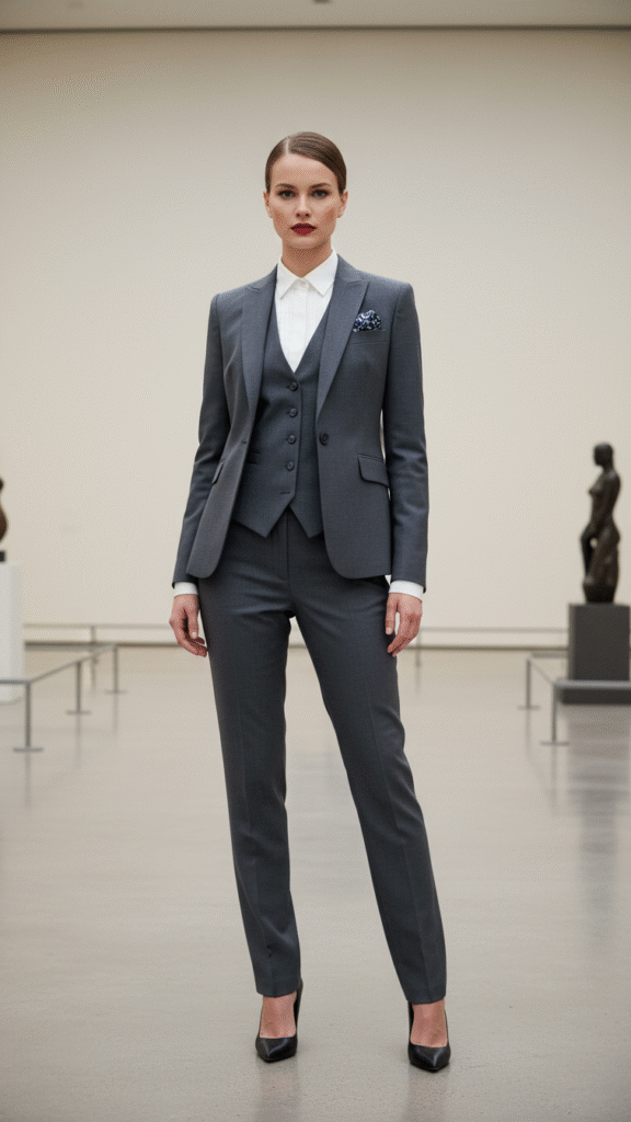 Complete your look with sleek jewelry pieces like geometric earrings or a minimalist watch. You’re building an ensemble that respects formal dress codes while showcasing your personal style and confidence.