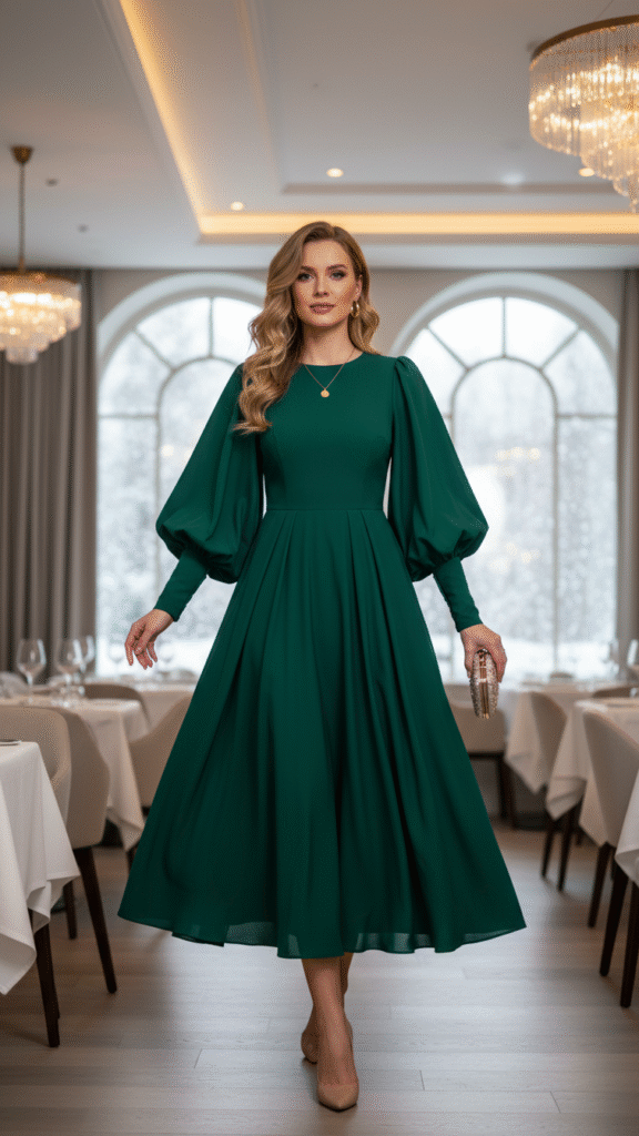 Elegant winter dinner outfit ideas provide balanced dressy looks for the occasion. Pair your emerald midi with nude heels to elongate your legs and minimal gold jewelry to complement the rich color. The midi length provides practical coverage while sitting, and the vibrant green photographs beautifully under warm restaurant lighting.