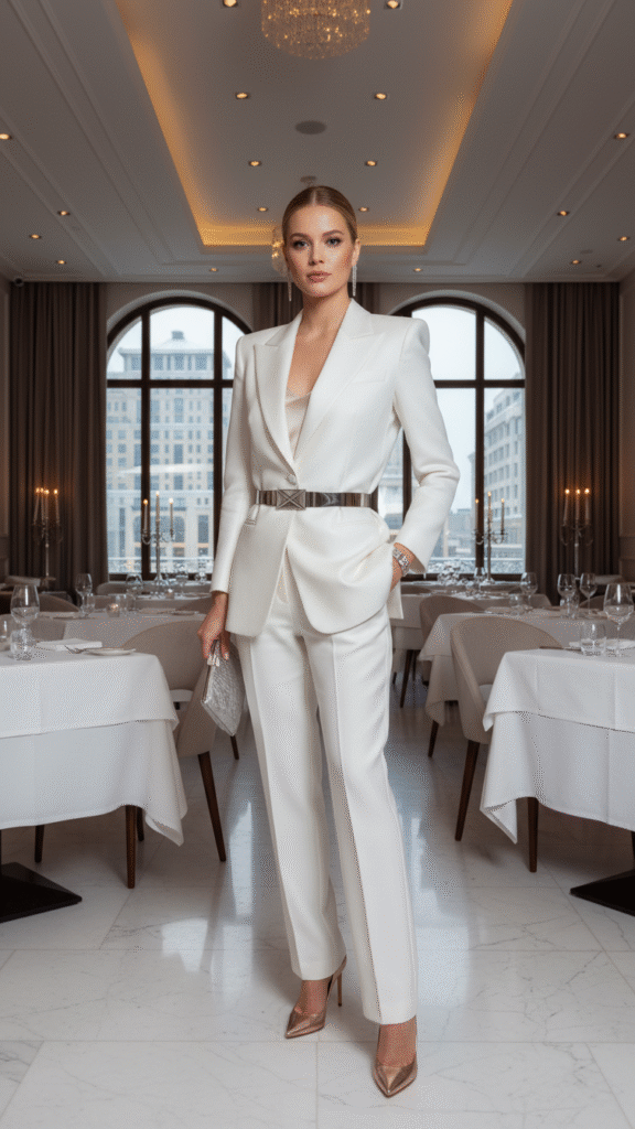 Choose a tailored silhouette that fits your body perfectly, ensuring sharp lines and structured shoulders. Your white blazer should hit at the hip, while pants can be straight-leg or slightly tapered. Add metallic accessories like a silver clutch, gold chain belt, or rose gold pumps to enhance the look.