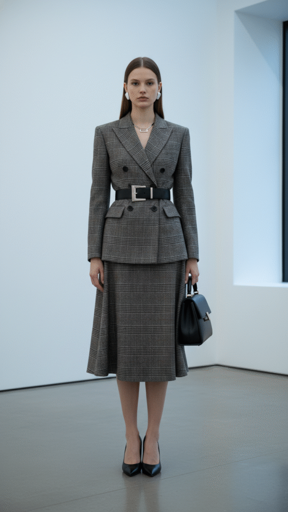 You’ll create visual interest by coordinating textures throughout your outfit. Try pairing the wool’s soft weave with smooth leather pumps and a structured handbag. Add statement belt accents to define your waistline and modernize the suit’s traditional silhouette. Choose metallic hardware or bold buckles that complement your plaid’s color palette.