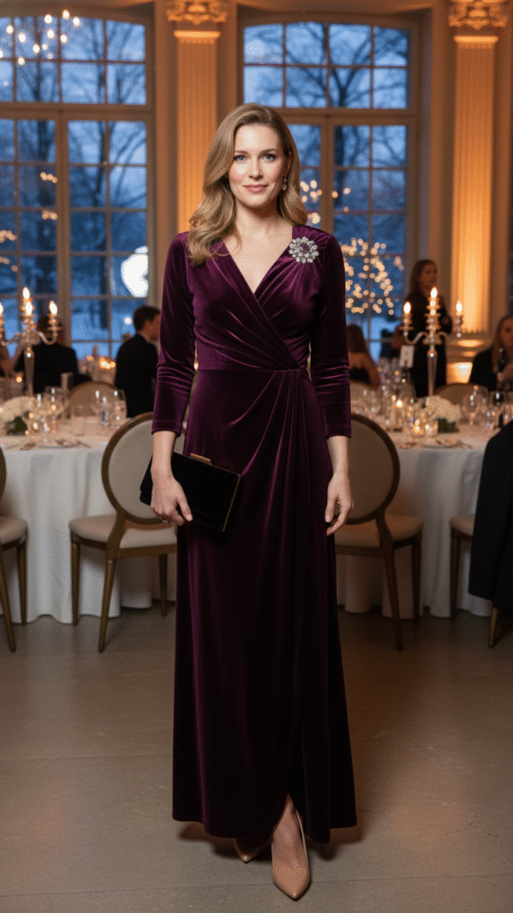 Setting yourself apart at a winter formal dinner becomes effortless when you choose a deep purple wrap dress styled with vintage brooches. This rich jewel tone perfectly complements the winter formal color palette while offering versatility and sophistication. You’ll find that wrap dresses naturally flatter various body types through their adjustable tie waist and flowing silhouette.