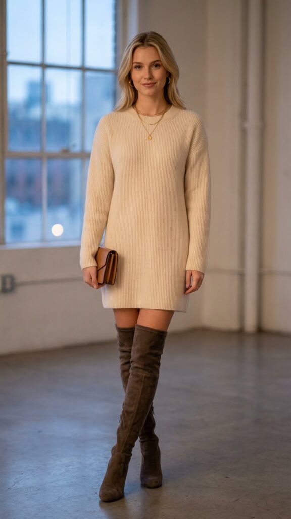 A cashmere sweater dress paired with over-the-knee boots creates one of the most refined yet comfortable winter date night looks you’ll find.