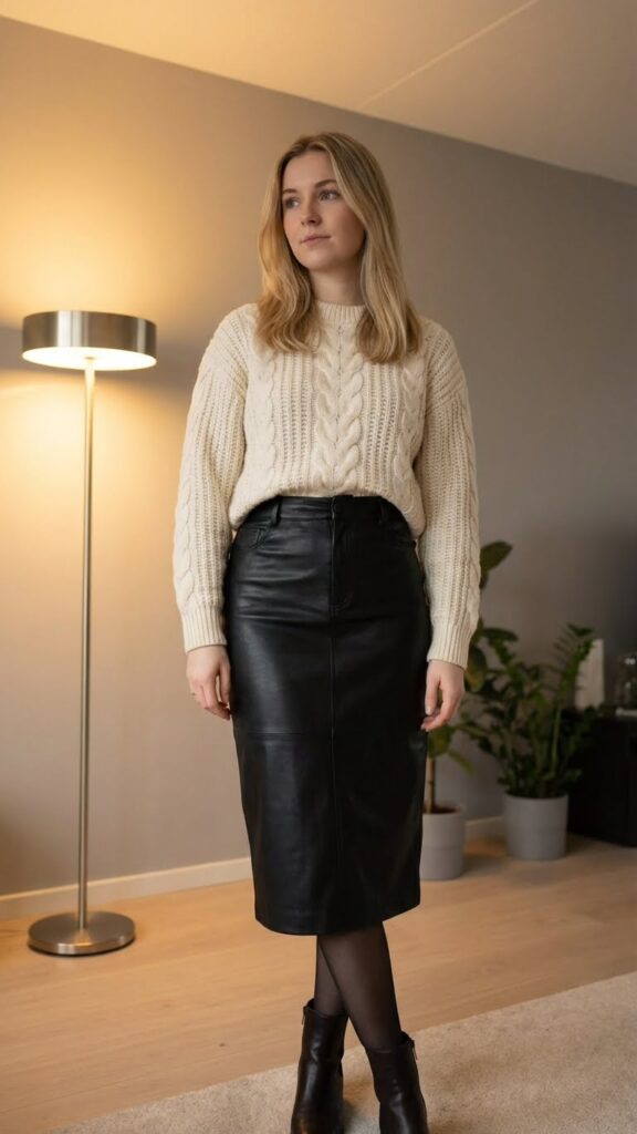 Cable knit sweaters tucked into leather skirts create one of the most striking texture combinations you’ll find for winter date nights. The chunky knit adds cozy warmth while the sleek leather brings sophisticated edge to your look.