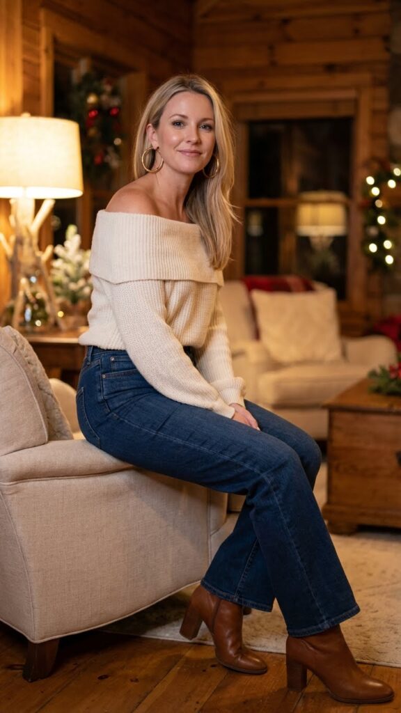 Complete your look with statement earrings that draw attention to your exposed shoulders and neckline. Choose heeled ankle boots to elongate your silhouette, and grab a structured clutch for your essentials. A delicate pendant necklace adds subtle elegance without overwhelming the sweater’s romantic design. You’ll feel confident and effortlessly chic all night.