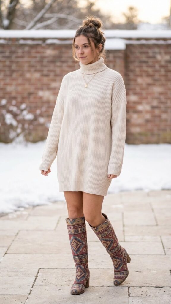 When you want your footwear to steal the show, pairing statement boots with a simple knit dress creates the perfect balance. Bold boots featuring metallic finishes, animal prints, or vibrant hues become your outfit’s focal point. The understated dress lets your footwear shine without competing for attention.