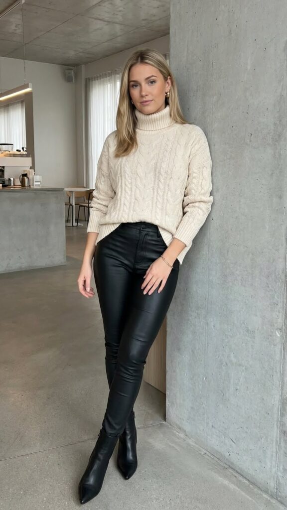 You’ll love how layered textures add visual interest to this classic combination. Try pairing faux leather with chunky knit or ribbed fabric for dimension. The contrast between sleek and soft makes this outfit unforgettable. Elegant winter date night outfit ideas can elevate your look for a sophisticated evening.