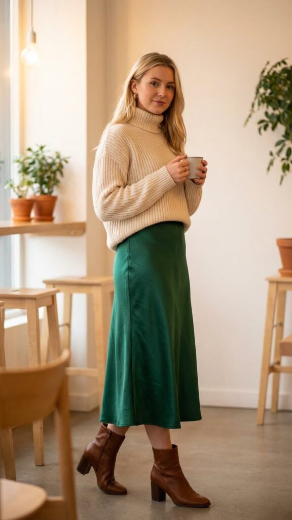 Satin midi skirts paired with chunky knit sweaters create a stunning contrast that’s perfect for romantic winter evenings. This combination balances elegance with cozy comfort, letting you express your personal style without sacrificing warmth.
