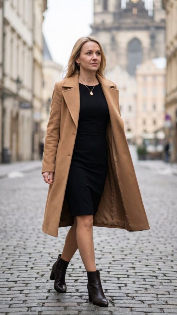 A classic wool trench coat draped over your little black dress creates an effortlessly refined winter date night look. This pairing gives you the freedom to move seamlessly from dinner reservations to evening strolls without sacrificing style or warmth.