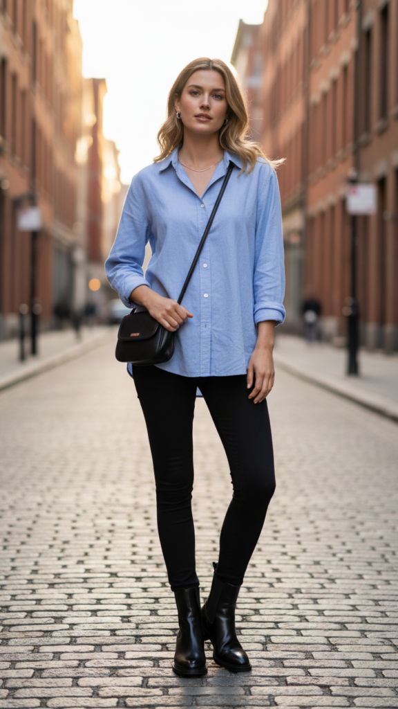 Few combinations offer more versatility than pairing a crisp button-down shirt with Chelsea boots over your black leggings. This outfit formula elevates basic essentials into a polished look that works for multiple occasions. You’ll appreciate how the structured shirt creates a sharp contrast against the fitted leggings, defining your silhouette beautifully.