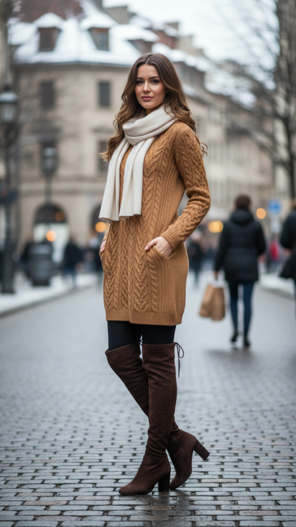 Choose a ribbed knit dress that hits mid-thigh to showcase your boots perfectly. The textured fabric adds visual interest and complements the sleekness of your leggings underneath. Pair this with suede thigh high boots for maximum impact and warmth.
