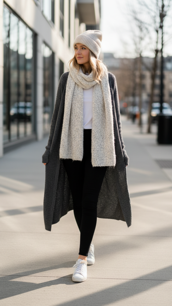 While oversized sweaters offer cozy warmth, long cardigans with white sneakers create a more relaxed, versatile winter look with black leggings. You’ll find this combination works perfectly for coffee runs, casual Fridays, or weekend errands. Choose a cardigan that hits mid-thigh or knee-length for the most flattering proportions with your leggings.
