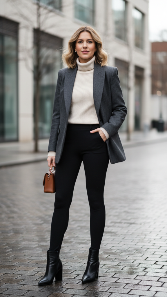 Layer a basic tee or turtleneck underneath, and you’re ready for coffee dates or casual Fridays. Ankle booties with block heels provide stability on icy sidewalks while maintaining style. Choose leather or suede options in neutral tones that complement your blazer collection. This combination alters athletic-inspired leggings into a polished outfit that moves seamlessly from morning errands to evening gatherings. Black leggings serve as the perfect foundation for everyday wear during the winter months. You’ll feel confident and unrestricted while looking effortlessly put-together.