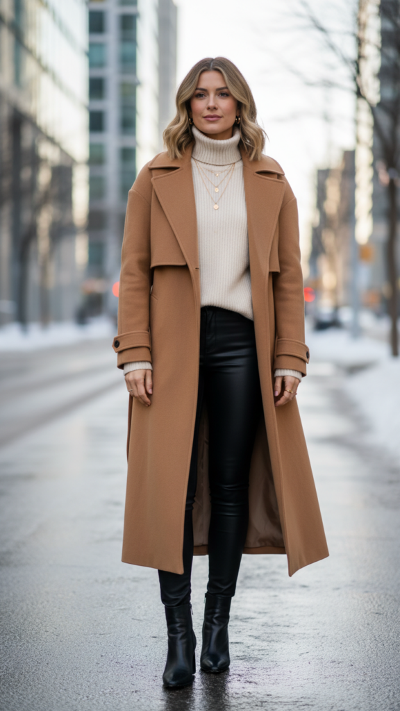 Layer your outfit with intention by selecting a mid-length or long trench in camel, navy, or black. These neutral tones complement your black leggings while maintaining versatility. Add layered accessories like delicate necklaces over the turtleneck or a structured scarf for extra dimension.