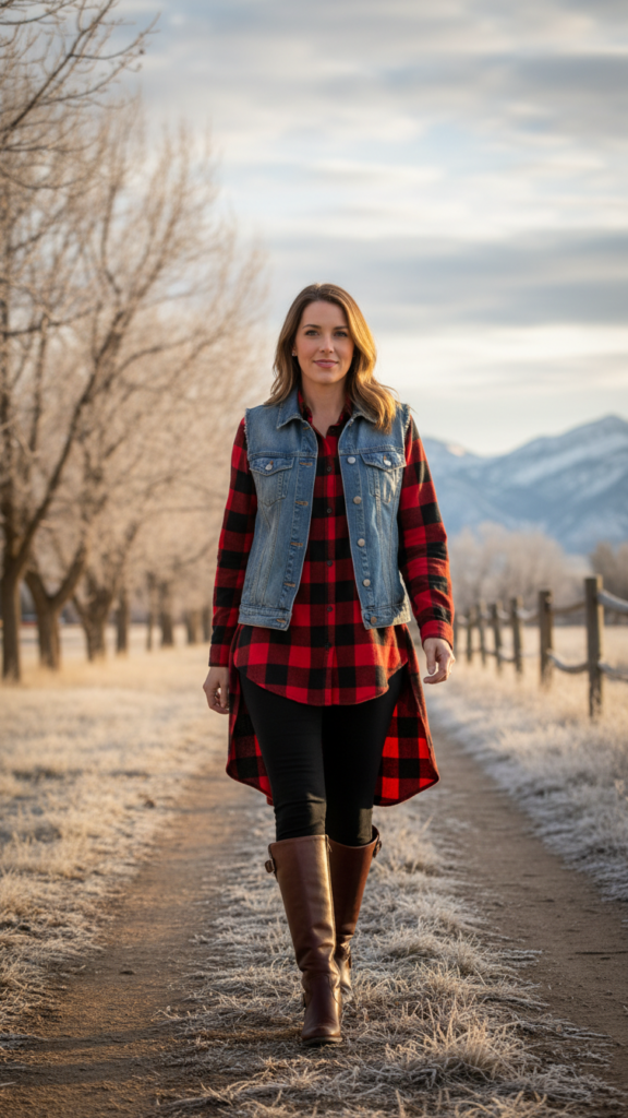 Choose a flannel in classic red and black or navy blue tones for maximum versatility. Tuck the front partially into your leggings to define your waistline and create a relaxed silhouette. Your riding boots should hit just below the knee, providing coverage and elongating your legs.