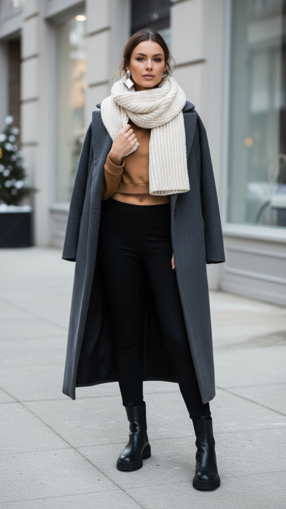 When you’re looking for a sophisticated winter outfit, combining a cropped sweatshirt with a long coat creates an effortlessly chic silhouette over black leggings. This layered combination works perfectly for both casual errands and dinner dates.