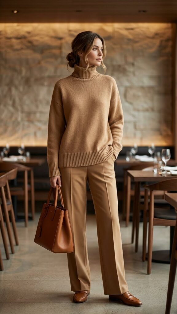 Try varying textures within your chosen color family. A camel cashmere sweater with tan wide leg pants and cognac accessories creates visual interest without the chaos. The monochrome approach is polished, professional, and way easier than actually coordinating patterns.