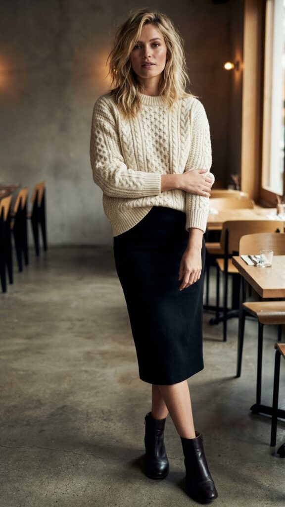Here’s where you get to play with contrast. A classic pencil skirt paired with a chunky or slightly oversized knit sweater is unexpected but completely works for work dinners.